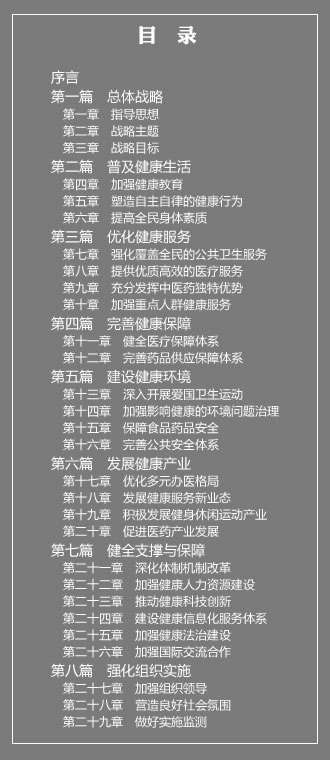 到2030年,促进全民健康的制度体系更加完善,健康领域发展更加协调,健康生活方式得到普及,健康服务质量和健康保障水平不断提高,健康产业繁荣发展,基本实现健康公平,主要健康指标进入高收入国家行列。到2050年,建成与社会主义现代化国家相适应的健康国家。